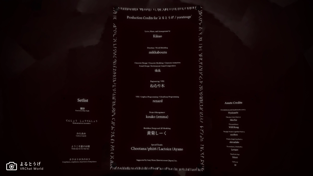 また、終了後のクレジットを見てみると、ゲームのMOD制作で知られるtktkさんが制作に携わっていたことを知り、非常に胸が熱くなりました。個人的に交流もさせて頂いていたので、こんな素敵なワールドの制作陣のひとりだったのかと分かると尚更嬉しくなりますね。